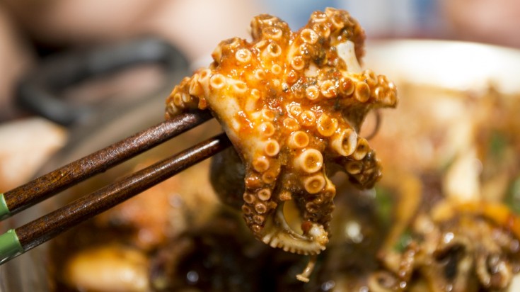 Pris sur la côte voisine, on ne peut aller bien loin à Séoul sans voir des jjukkumi sous une forme ou une autre. Il y a même une statue de pieuvre dans la rue Jjukkumi. L’une des versions les plus populaires est le jjukkumi bokkeum, où des poulpes entiers sont cuits et mélangés à une sauce gochugang incroyablement épicée.