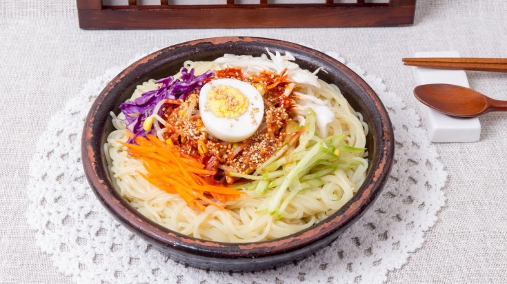 Parfait pour les journées d’été chaudes et humides de la capitale, ce plat est en fait originaire de l’autre côté du 38e parallèle, en Corée du Nord. Parfois appelées Pyeongyang naengmyun, du nom de la capitale nord-coréenne, les nouilles de sarrasin sont cuites puis refroidies avant d’être mélangées à des légumes coupés en dés et nappées de sauce gochugang.