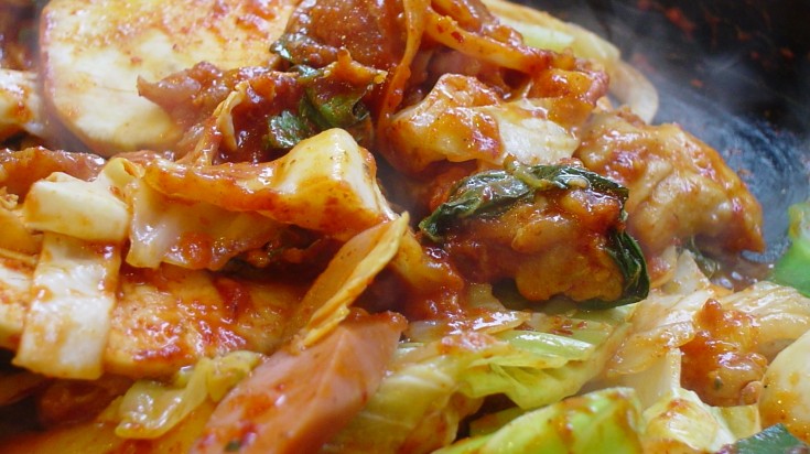 Originaire de la ville de Chuncheon, dans la province de Gangwon, le dakgalbi est aujourd’hui l’un des plats préférés des Séouliens. Des cubes de poulet sont marinés dans la sauce gochujang omniprésente, puis sautés sur une plaque chauffante avec du chou, de la patate douce, des feuilles de périlleux, de l’oignon et des galettes de riz tteok.