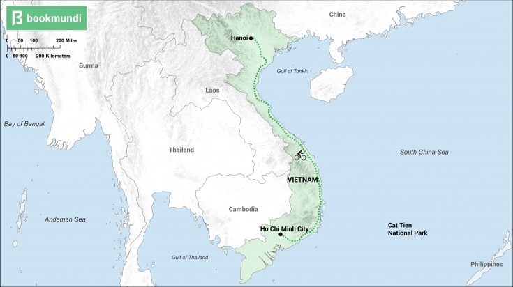 L’ajout de la route vers le parc national de Cat Tien confère une nouvelle dimension à tout circuit cycliste au Viêt Nam. Situé dans le sud du Viêt Nam, à environ 150 kilomètres au nord de Ho Chi Minh, le parc national de Cat Tien conduit les cyclistes intrépides le long de tubes de lave, de plantations d’hévéas et de caféiers, et d’étendues de forêt de teck, avant de serpenter à travers le territoire des éléphants sauvages, au milieu de sa riche forêt tropicale humide de plaine et de ses écosystèmes sempervirents inondés par les marécages. Le parc est un endroit idéal pour faire du VTT et observer la faune et la flore grâce à son extraordinaire biodiversité. L’insaisissable rhinocéros de Java y côtoie des tigres, des gaurs et des oiseaux exotiques. Le sentier de VTT lui-même comporte des sections escarpées de roches volcaniques qui constituent un véritable défi.