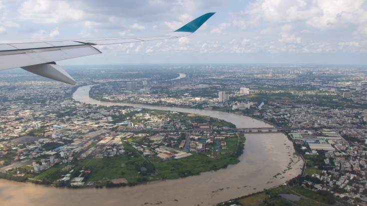 Les compagnies aériennes nationales comme Vietnam Airlines, Vietjet Air et Bamboo Airways proposent plus de 30 vols quotidiens. La distance dépend de votre itinéraire : survoler le Laos et le Cambodge représente 1 190 kilomètres, tandis que traverser l’espace aérien du Viêt Nam en représente 1 276.
