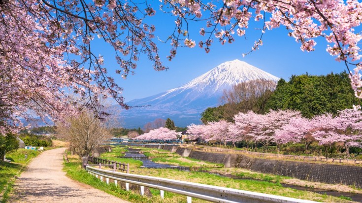 La préfecture japonaise de Shizuoka se trouve sur la côte pacifique de l’île de Honshu et est célèbre pour abriter le puissant mont Fuji, le plus haut sommet du pays. Dans la région, il existe de nombreux endroits fantastiques où admirer les cerisiers en fleurs, notamment le sanctuaire Okuni, le parc du château de Hamamatsu, le cimetière de Fuji et Sakura no Sato. Pour des vues spectaculaires du mont Fuji et des cerisiers en fleurs, vous voudrez explorer la région des cinq lacs de Fuji vers la mi-avril.
