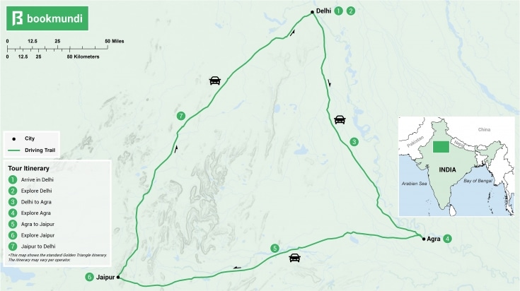 | Lieu de début/fin : | Delhi est le point de départ habituel, suivi d’Agra et de Jaipur. Le point d’arrivée se situe à nouveau à Delhi. |