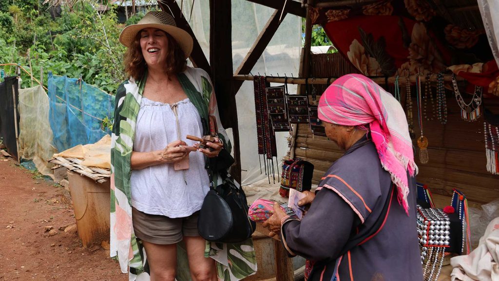 Au coin de la rue, je trouve une femme locale portant des vêtements traditionnels de la tribu Akha à la seule et unique boutique de souvenirs. Une discussion rapide avec cette charmante personne et un paiement équitable plus tard, je repars avec un magnifique bibelot qui occupe désormais une place de choix dans ma maison.